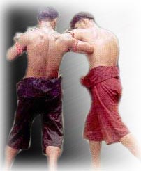 This Kon Muay is the main style to sidestep out of the straight punch and counter by the elbow. The attacker walks in and throws the left punch to the defensives face. The defensive steps out quickly by the right foot obliquely to out circle (the weight on the right leg) close to the attacker.
