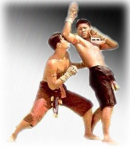 This trick is similar to the trick in SAI LUEW LANG (Sok Chieng Lang: skew back elbow) but throws the elbow straight to the opponent's face. This trick is used when the opponent just to attack.