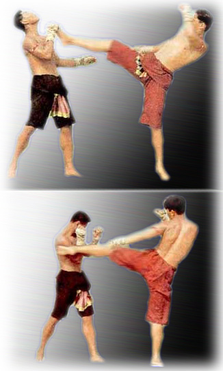 In English mean throws the straight kick and a swing kickThe boxer throws the left foot to the opponent's Adam's apple or presses to the neck which puts the opponent off his balance. Then throws the right swing back kick to the opponent' s rib. This trick is used for attack, defense counter move or escape.