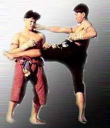 Throws the punch and kick at the same timeThe boxer throws the right punch to the opponent's chin and swings the left kick to the opponent’s rib. This trick is used for attack; defense or