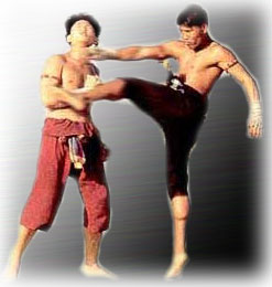 If the boxer uses the left foot the same as the foot tricks in MANOP LEN KHA (swing-back kicks) but includes throwing the right punch to the opponent's chin and throwing the left foot the right rib. This trick is used for attack, defense, counter move or escape.