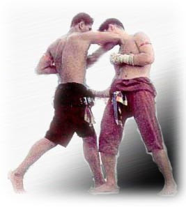 The boxer swings up the tip of the right of elbow to the opponent's jaws and steps the right foot forwards. This trick is used for attack, defense or escape.